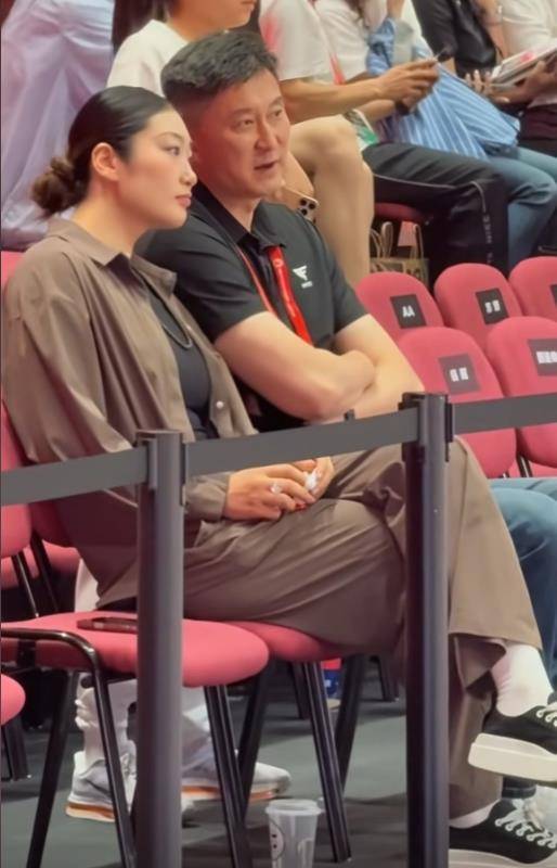 中国女篮核心球员李梦还坐在杜锋指导旁边,因为都是篮球圈儿的人互相都很熟悉,两人讨论球场上情况。