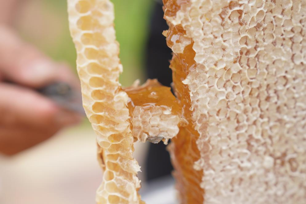 图为蜂农在割蜜